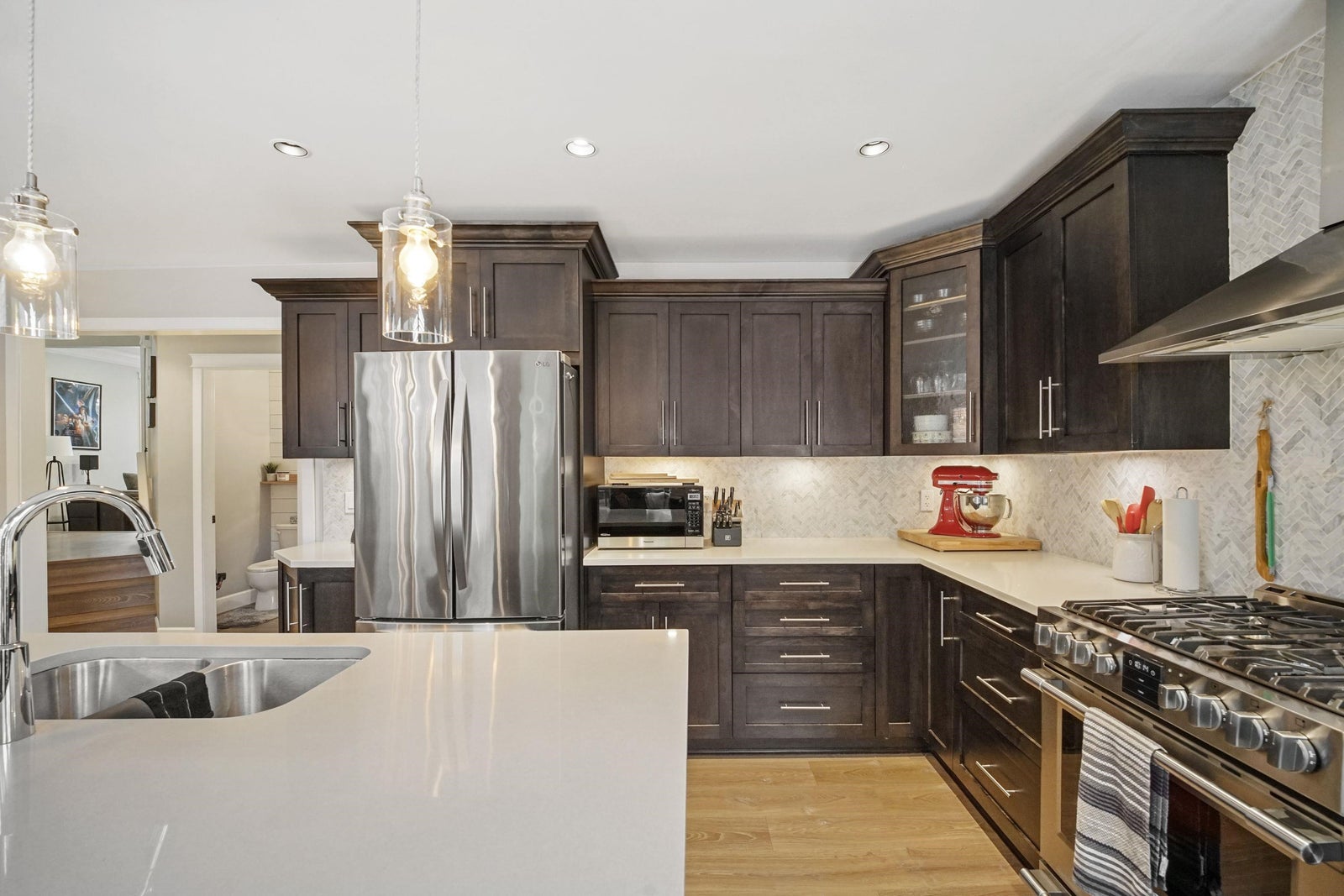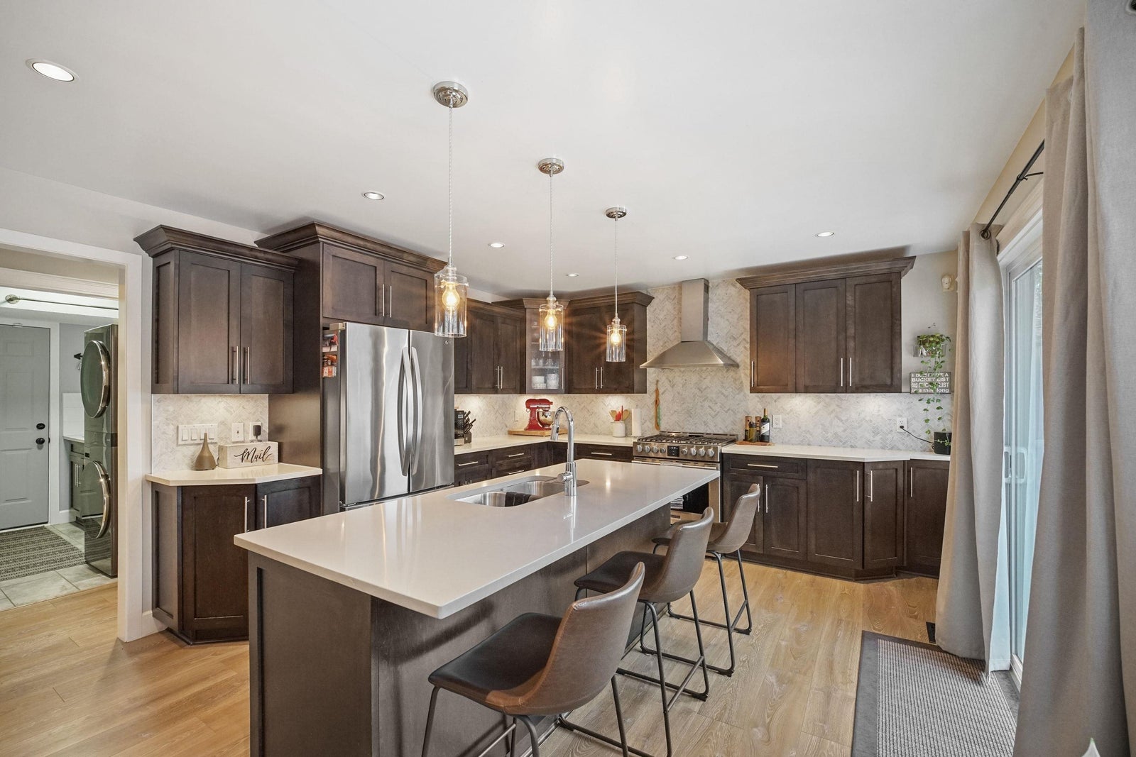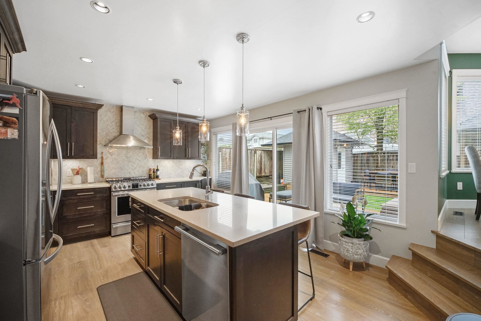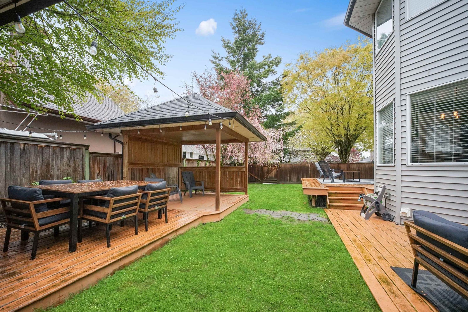 Beautifully renovated and immaculately maintained 2 level home on the hill in Cloverdale on corner lot with RV parking. Highly sought after quiet neighborhood yet close to everything. Completely renovated - floors, molding, bathrooms and kitchen with S/S appliances huge island and quartz counter tops. 3 bds up, large primary with 9ft. ceilings, sitting area and luxurious ensuite. 2 sets of patio doors open to your private fenced yard with multiple decks, gazebo, storage shed + a high efficiency furnace. Great location, and excellent home!